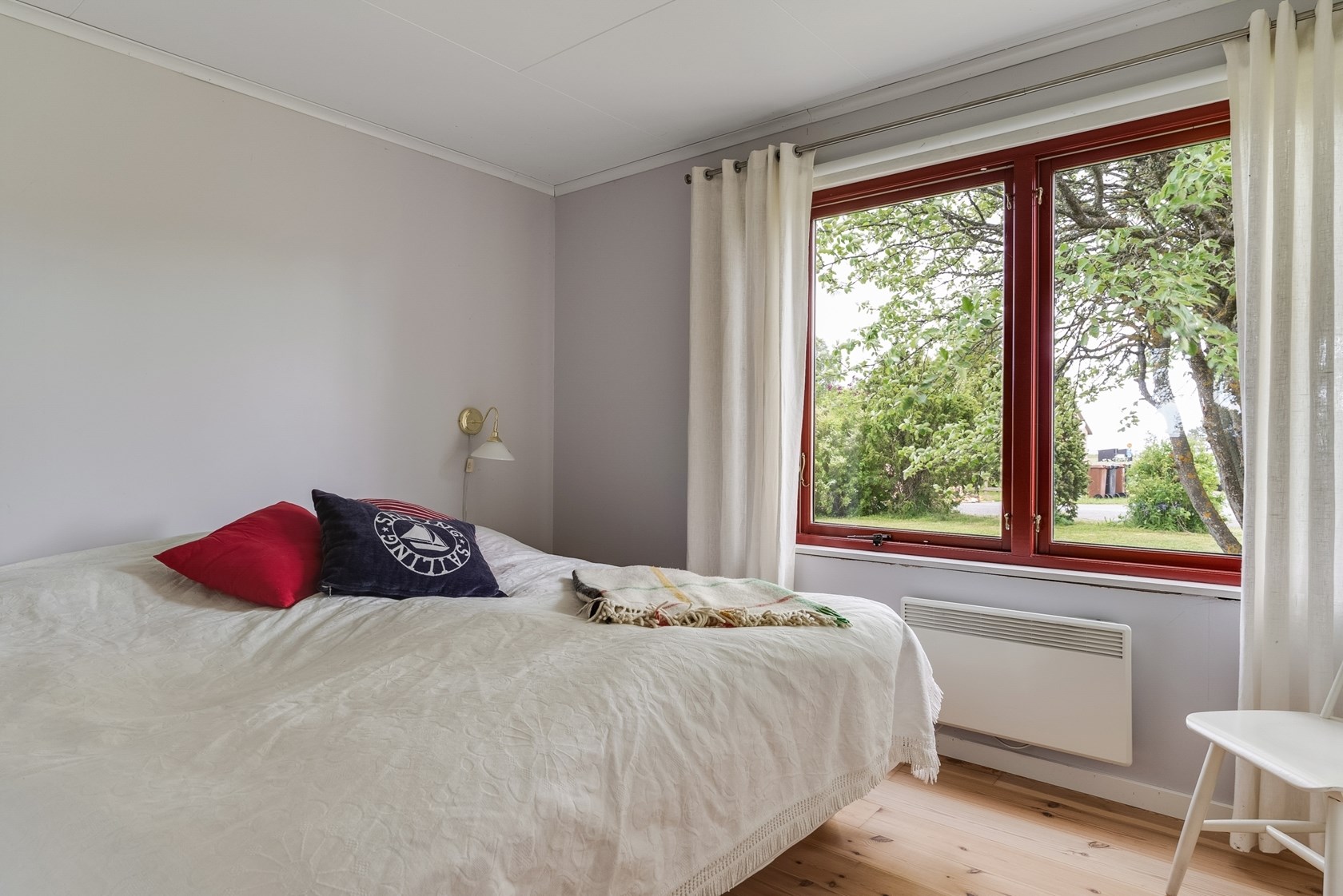 Husets tre sovrum är välkomnande, med ljusa väggar och vackra trägolv.