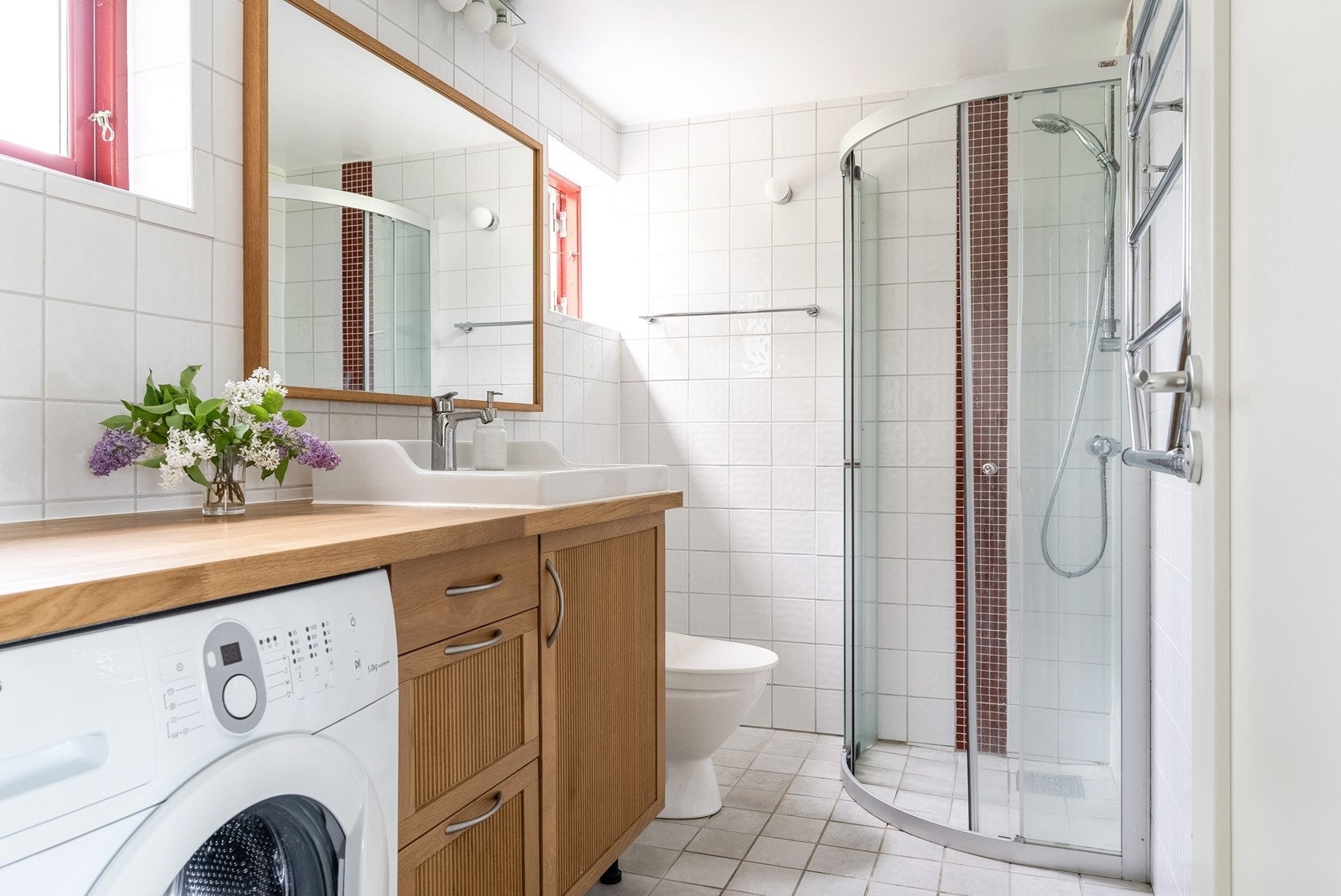 Det helkaklade badrummet går i vitt med kommod i trä och röda detaljer som skapar en fin kontrast. Här finns golvvärme, dusch, tvättmaskin samt handdukstork.
